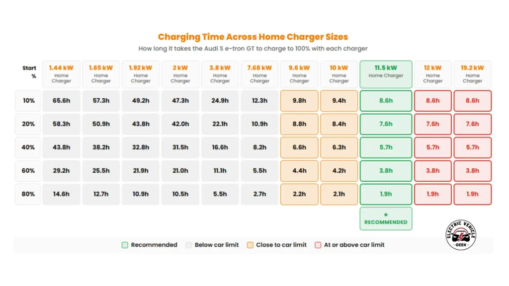 While the OEM 9.6 kW charger works, we recommend upgrading to an 11.5 kW EV charger. Most e-tron GT models accept a maximum of 11 kW, so the extra 0.5 kW capacity does not increase speed but ensures full compatibility and future-proofs your home setup.