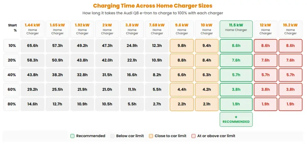 The chart compares how long it takes to charge the Audi Q8 e-tron from different starting battery levels using home chargers from 1.44 kW up to 19.2 kW. The car has an onboard charger limit of 11 kW, so the best match is a 11.5 kW home charger, shown in green. Chargers above 11 kW are marked in red because the Audi Q8 e-tron cannot use the extra power, so they charge at the same speed as a 11 kW charger.