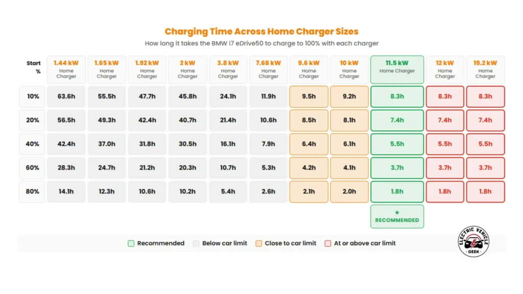 The chart compares how long it takes to charge the BMW i7 eDrive50 from different starting battery levels using home chargers from 1.44 kW up to 19.2 kW. The car has an onboard charger limit of 11 kW, so the best match is a 11.5 kW home charger, shown in green. Chargers above 11 kW are marked in red because the BMW i7 eDrive50 cannot use the extra power, so they charge at the same speed as a 11 kW charger.