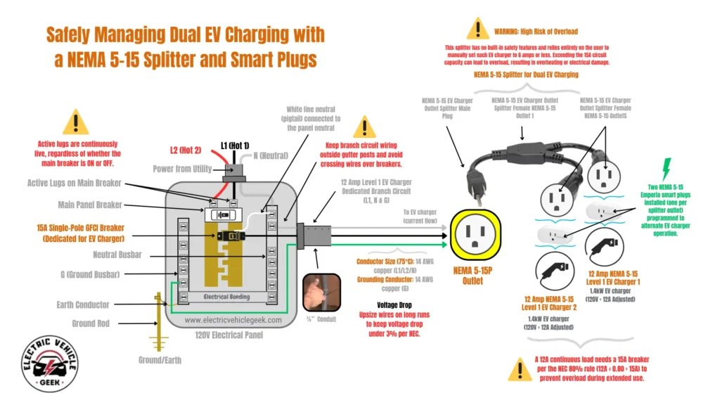 As shown in our electric vehicle branch circuit diagram below, we connected the splitter into a 120V, 15-amp branch circuit wired with 14 AWG copper and protected by a dedicated 15A single-pole EV charger circuit breaker. We then plugged in two Level 1 EV chargers, each adjusted to draw 6 amps (approximately 0.72 kW), resulting in a combined load of 12 amps. This falls within the National Electrical Code (NEC) continuous load limit of 80% for a 15-amp circuit, which equals 12 amps.