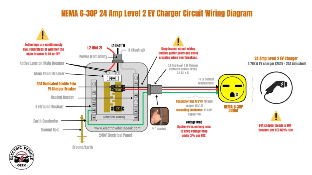 The diagram below shows a 240V setup for a 24A Level 2 EV charger (5.76 kW) using a NEMA 14-30P plug. A 30A double-pole breaker feeds four 10 AWG copper wires – black and red (Hot), white (Neutral), and green (Ground) – through a conduit to the NEMA 14-30P outlet, where the charger plugs in.
